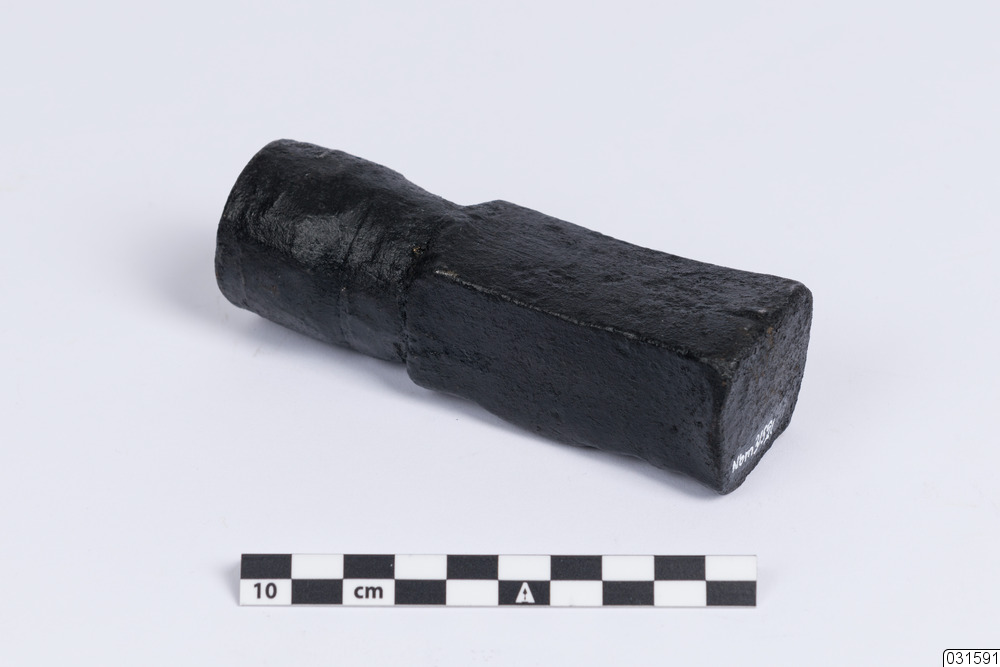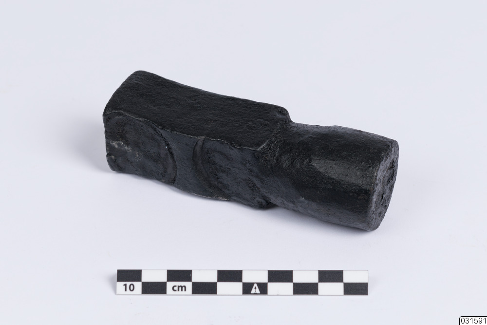 En cylinderformad axeltapp med två järnstämplar från Rosfors bruk.