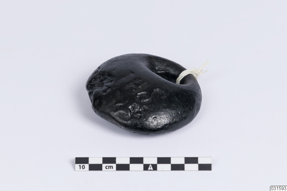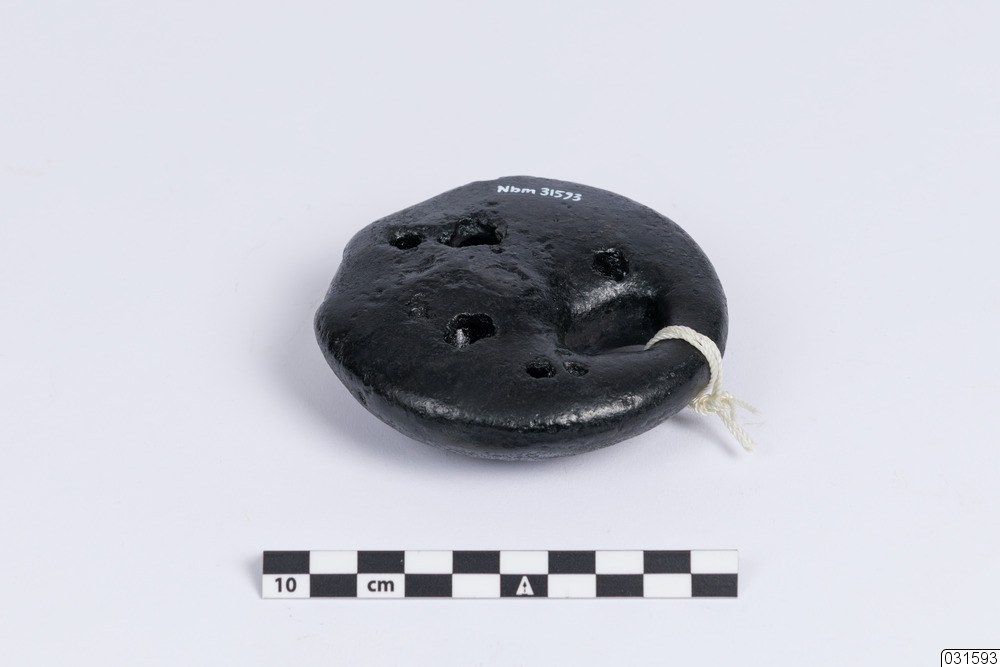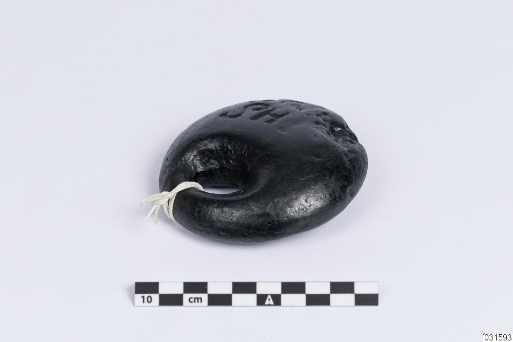 Ett cirkulärt sänke för att tynga ned nät med en järnstämpel från Hellefors bruk. I toppen finns det även ett hål för att kunna fästa sänken vid nätet.