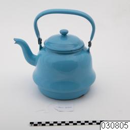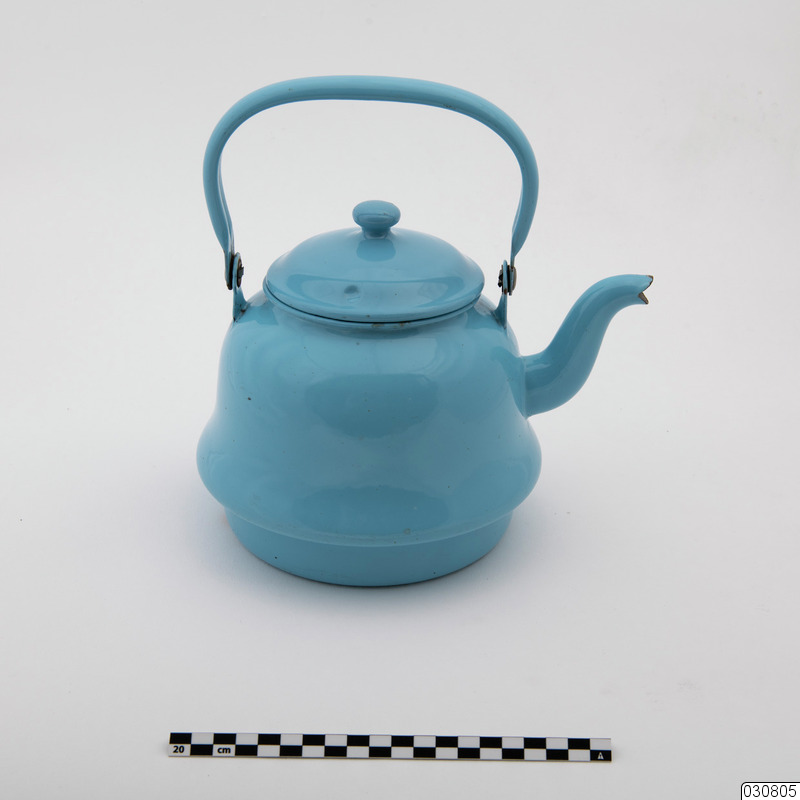 Större panna i metall med ljusblå emaljering av alla delar. Komplett med lock och handtag. Botten utformad med hänsyn till att användas på spis som vedeldas.