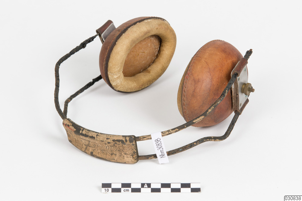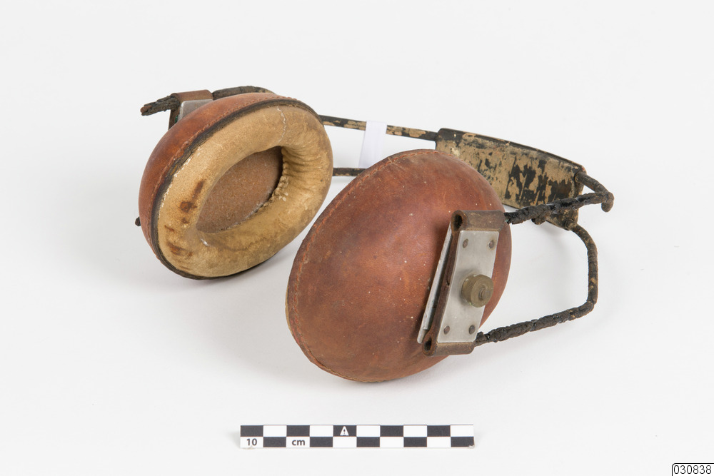 Ett par äldre hörselkåpor med kåpor av två sorters skinn och båge av metall. Ytterdelen av kåpan är av mörkare skinn medan innerdelen är av ljusare. Kåpornas stoppning är sannolikt av skummgummi. Bågen är fäst i mitten av kåpornas yttersida med metallbrickor och skruvar. Mellan metallbrickorna sitter en bit läder. Två tjockare ståltrådar löper parallellt som båge och i mitten av bågen finns en 9 cm lång hjässbygel.