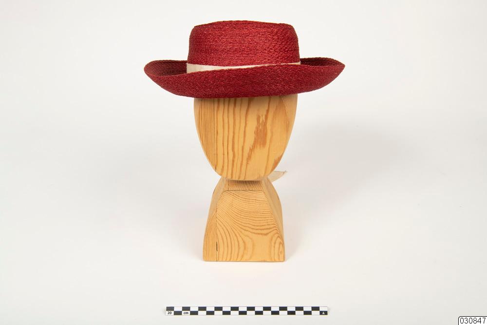 Röd stråhatt med lätt uppåtböjt brätte. Runt huvudbonaden är ett räfflat band fastsytt och uppe på kullens mitt finns en knapp. Både bandet och knappen har samma nyans av beige. På insidan av hatten är ett brunt band fäst och inunder det ett gummiband.