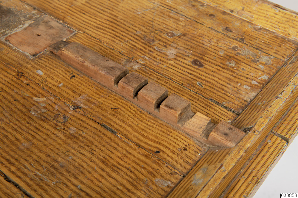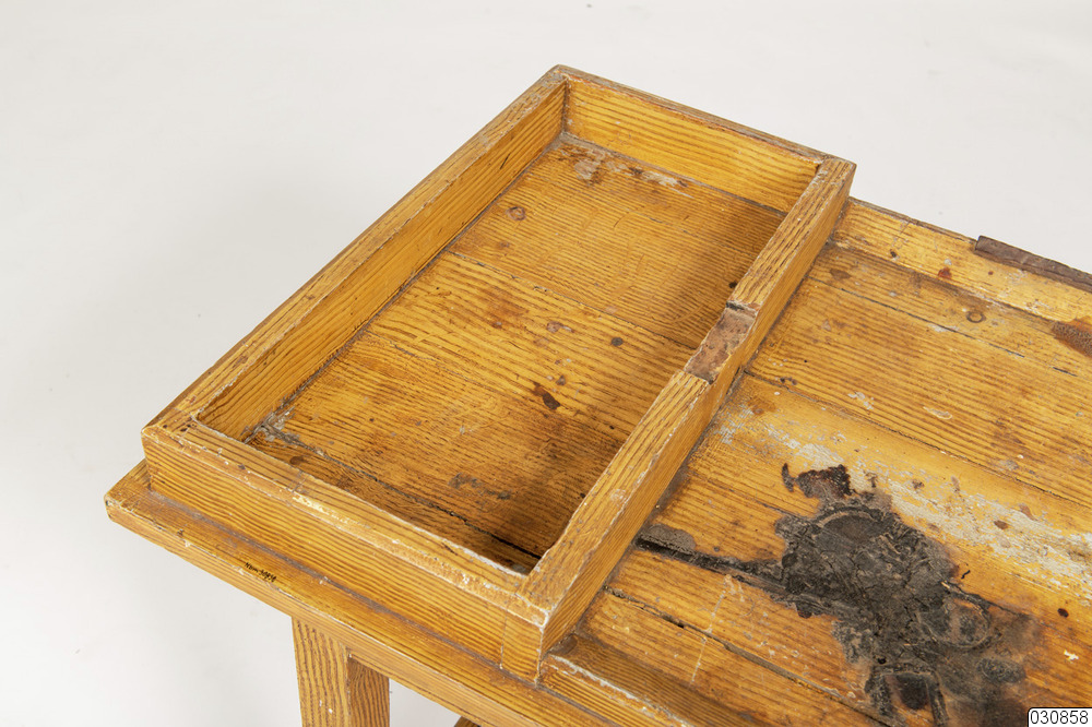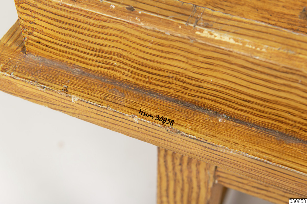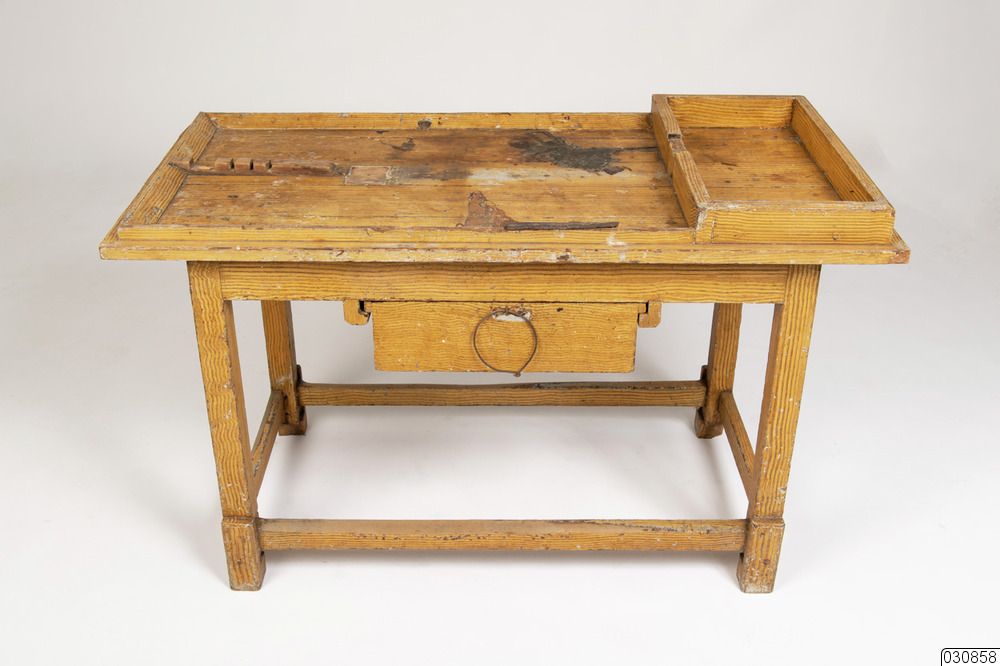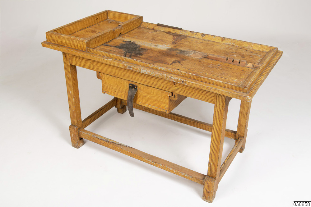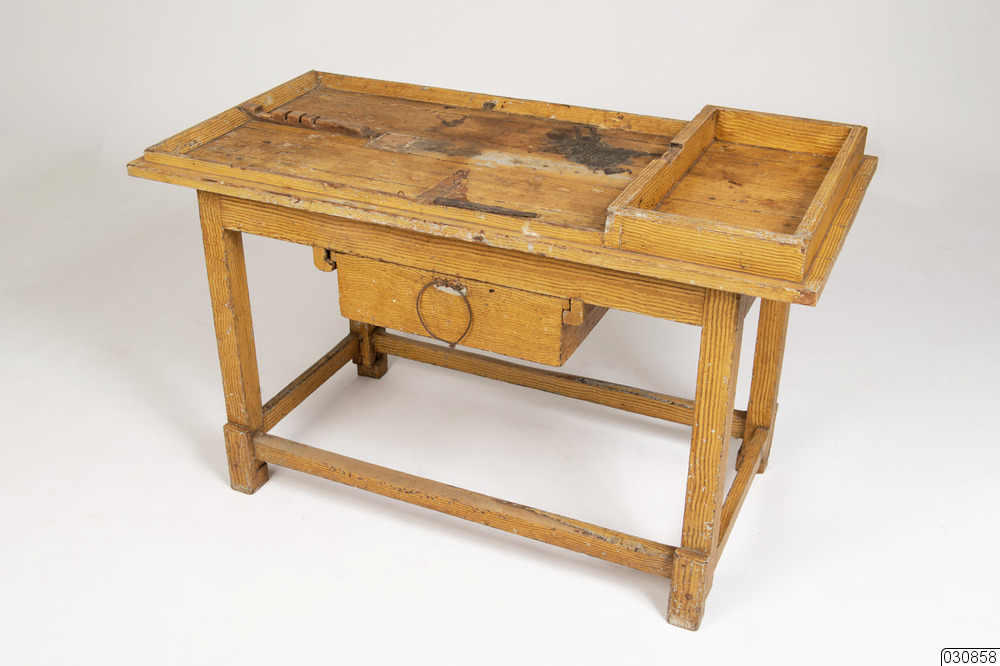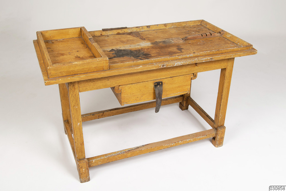 - Skomakarbord eller bänk av trä med fyra ben och tvärslåar mellan benen.Bänken har en utdragbar låda under skivan. Skivan består av fem ihopspontade brädor och har en list runt om. På ena kortsidan finns en rektangelformat högre sarg. På andra kortsidan av bänken, i mitten av listen, löper en smal omålad trälist med spår, kanske för förvaring av verktyg. Bänken är dekorationsmålad. På undersidan av lådan finns är det skrivet i blyerts, så även på undersidan av bänken där lådan skjuts in. Har funnits på gården så länge givaren kan minnas och sett ut på samma vis. Fadern hade lärt sig lite om skomakeri av sin far och kunde göra vissa delmoment.