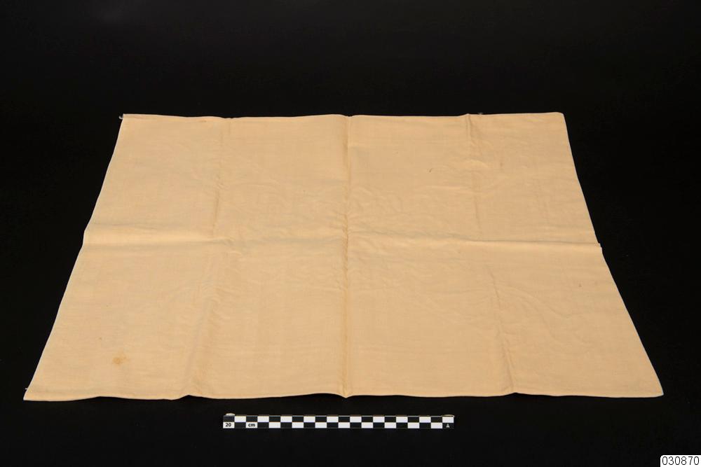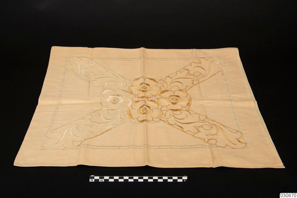 Kuddfodral till prydnadskudde. Mörkbeige eller sandfärgad textil med kryssformad brodering i två färger på framstycket. Öppning för kudde på höger kortsida. Mönstret är broderat som en rektangel fem cm in i tyget. I mitten av den broderade rektangel finns en oval och tvärs igenom ovalen går ett kryss ut till den broderade rektangelns hörn. Den broderade ovalen har fyra blommor broderade på tyget och i mitten av varje blomma finns ett hål i tyget.