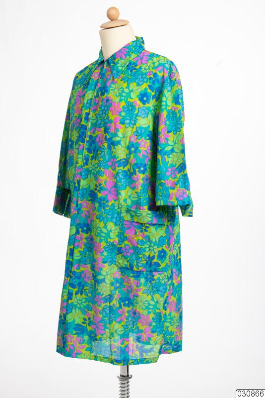 Blommönstrad nylonklänning med 3/4- dels ärm och 46 cm lång dragkedja som utgår från halslinningen. Krage med spetsiga snibbar. Två fickor påsydda. På insidan av kragen finns en fastsydd etikett där märket "Vinetta" går att läsa samt att den är gjort av "100% Nylon". I vänster hörn finns symbolen för KF och på baksidan av etiketten finns tvättrådet "Fintvätt 40" samt en mindre etikett med storleksmärkningen "46". Inköpt på Konsum i Luleå.