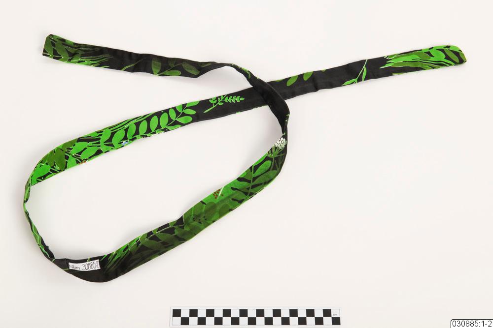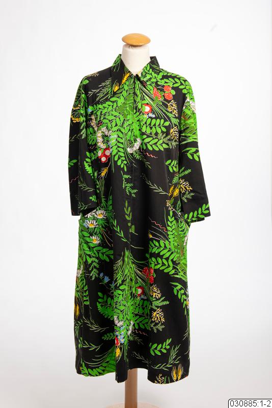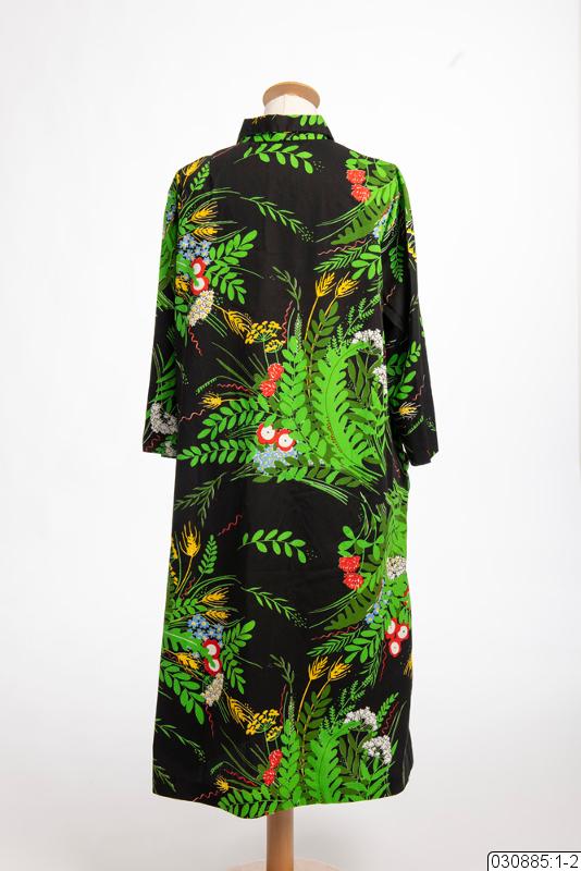 - Klänning med 3/4- dels ärm och krage i växtmönstrat tryckt tyg med svart grund. Kragen har spetsiga smibbar och en 43 cm lång dragkedja går upp till halsen. Två insydda fickor på vardera sida om klänningen. Mönstret består av buketter med både blommor och växter. Tillhörande tygband av samma tyg som är 158 cm långt och 3,5 cm brett.