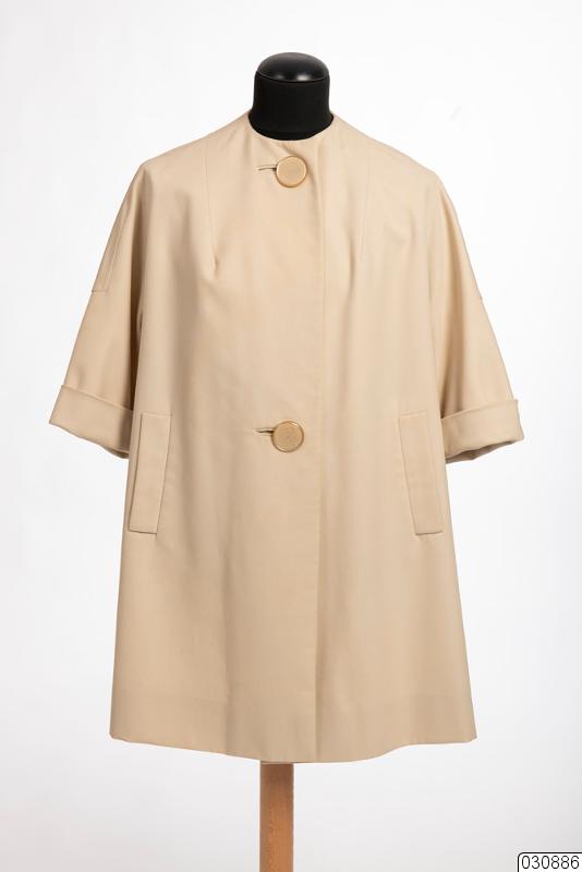 - Beige kappa som är vid i modellen med rund hals och knäpps framtill med två stora knappar i plast. Två fickor av stolptyp finns på vardera framstycke och kappan har ett tunt innerfoder av syntetiskt material. På kappans högra insida finns en etikett fastsydd med texten: "Boussa de Paris, homologué Tergal fibre polyester, Marque déposee". På den vänstra sidans insida finns en etikett med texten: "Dahlmans Sundsvall".