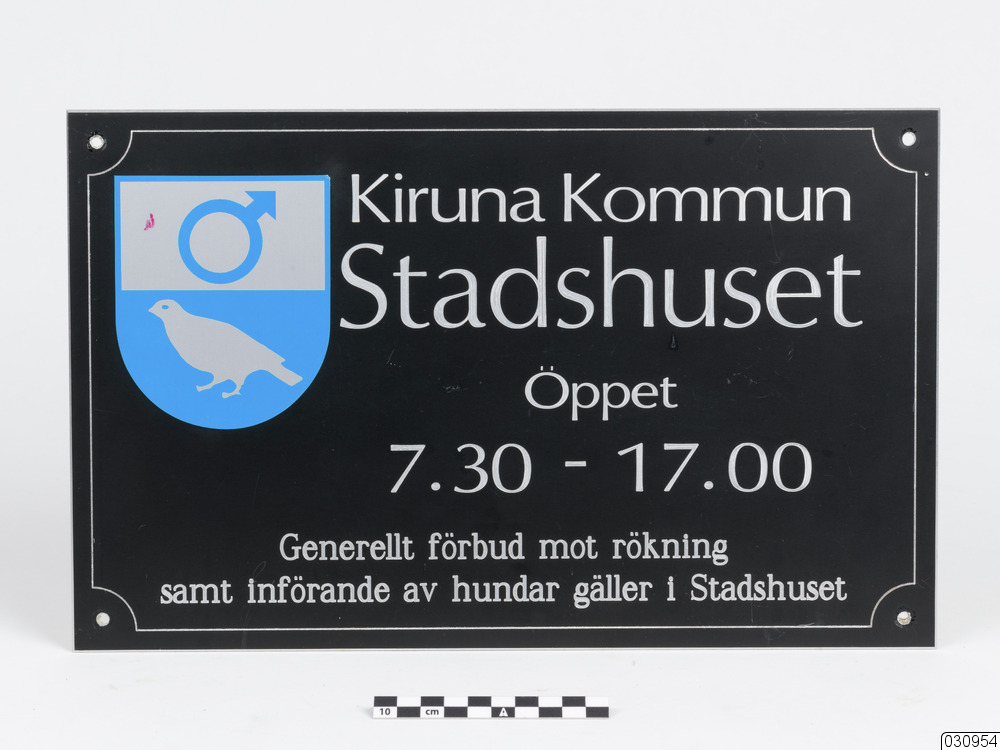 Informationsskylt med Kiruna stadshus öppettider. Skylten är svart med ingraverade bokstäver i aluminium, i vänstra översta hörnet är Kiruna kommunvapen bestående av en blå sköld med en ripa i silver i nederkant och en silvrig rektangel med en blå symbol för järn. På skylten står det: Kiruna Kommun, Stadshuset, Öppet, 7.30-17.00, Generellt förbud mot rökning samt införande av hundar gäller i Stadshuset.