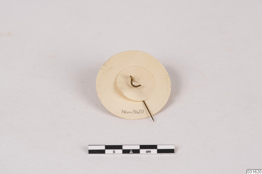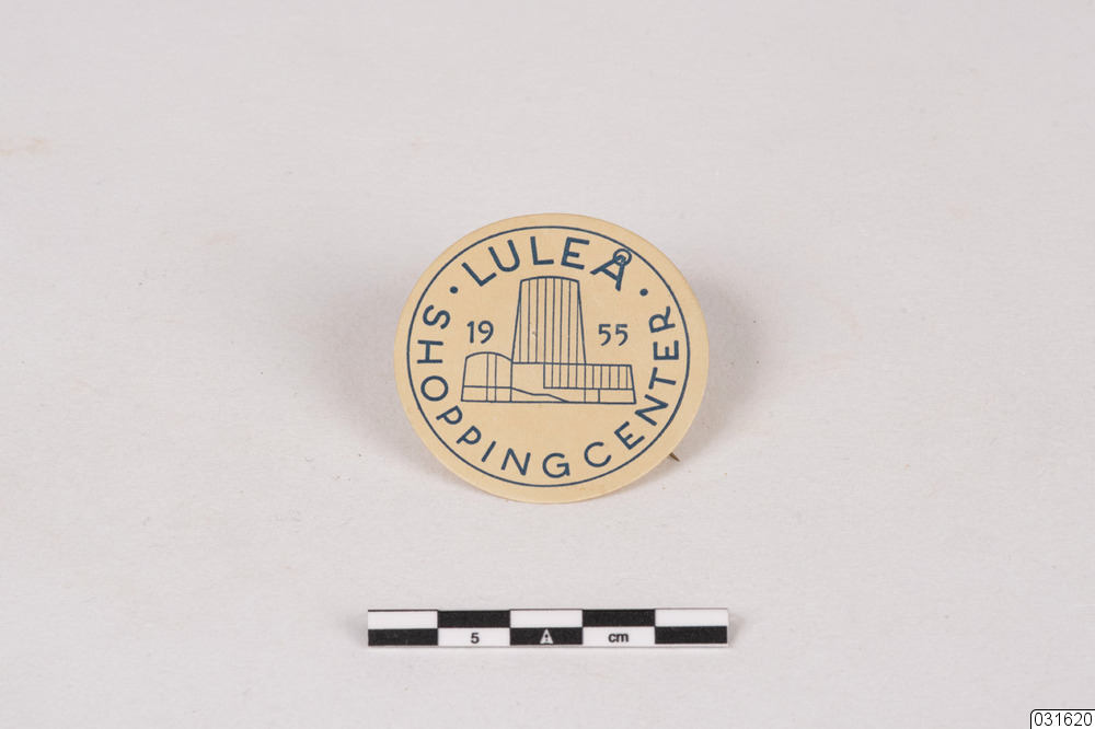 Ett pins av papper med metallnål och tryck med texten "Luleå Shoppingcenter 1955" samt en illustration av en byggnad. Pappret är naturfärgat och trycket är blått eller svart.