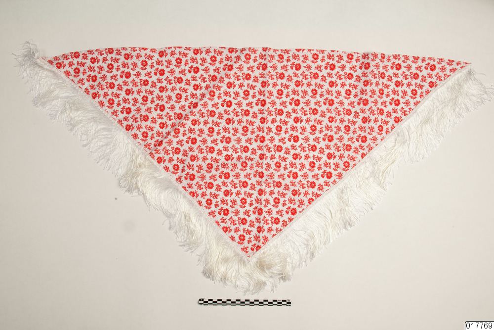 Samisk schal. Trekantig schal med vit, silkig frans utmed de två kortare sidorna. Frans L 9 cm av syntetmaterial. Fållad på maskin. Bomullstyg, vit botten med röda blommor och blad. Tryckt mönster.