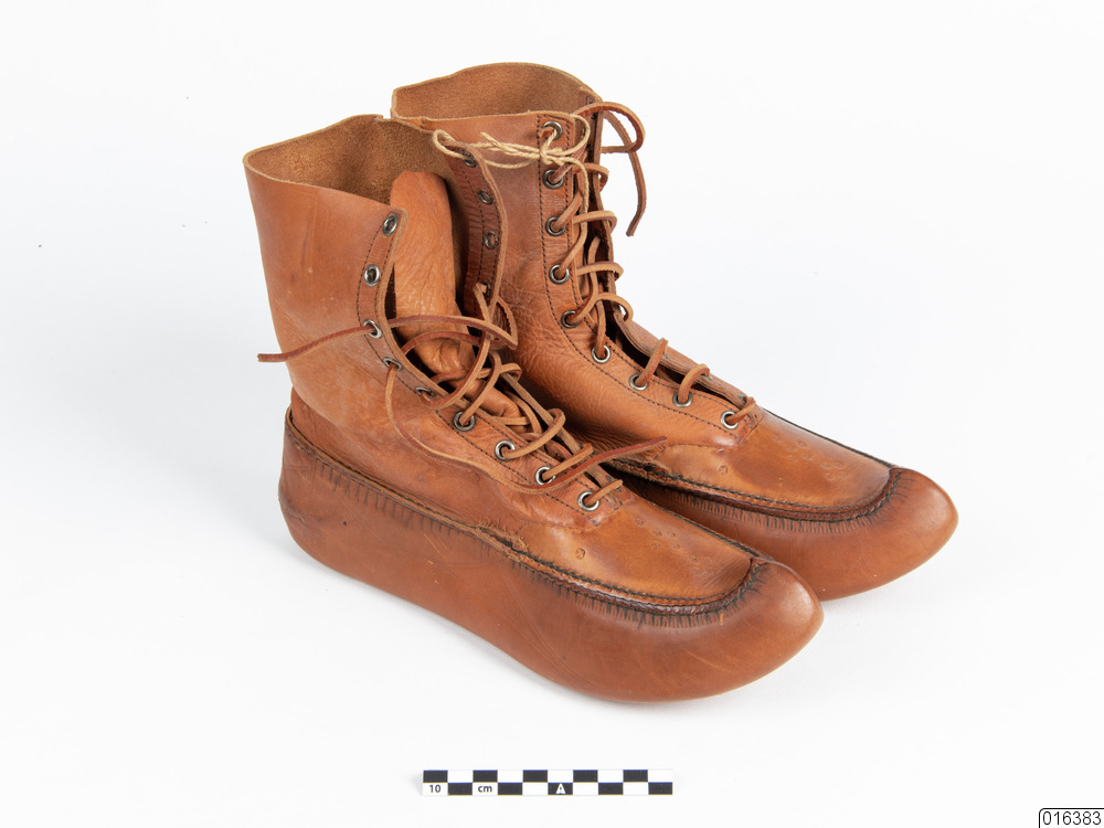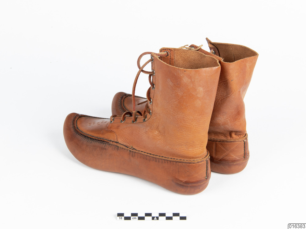 Ett par remskor med kort skaft och med antydan till näbb i tån. Nio par söljor av vitmetall sitter i varje sko. Sula och sidor format av ett stycke. Remmad med lädersnören. Skorna har säljarens gamla stämpel kvar under sulan: "A-B LUNDBERGS LÄDER- OCH PÄLSVARUINDUSTRI, STATIONSGATAN 43, LULEÅ, TEL 592". De har ett pressat mönster med reliefverkan på sidor och ovansida. Antal delar: 3 st.