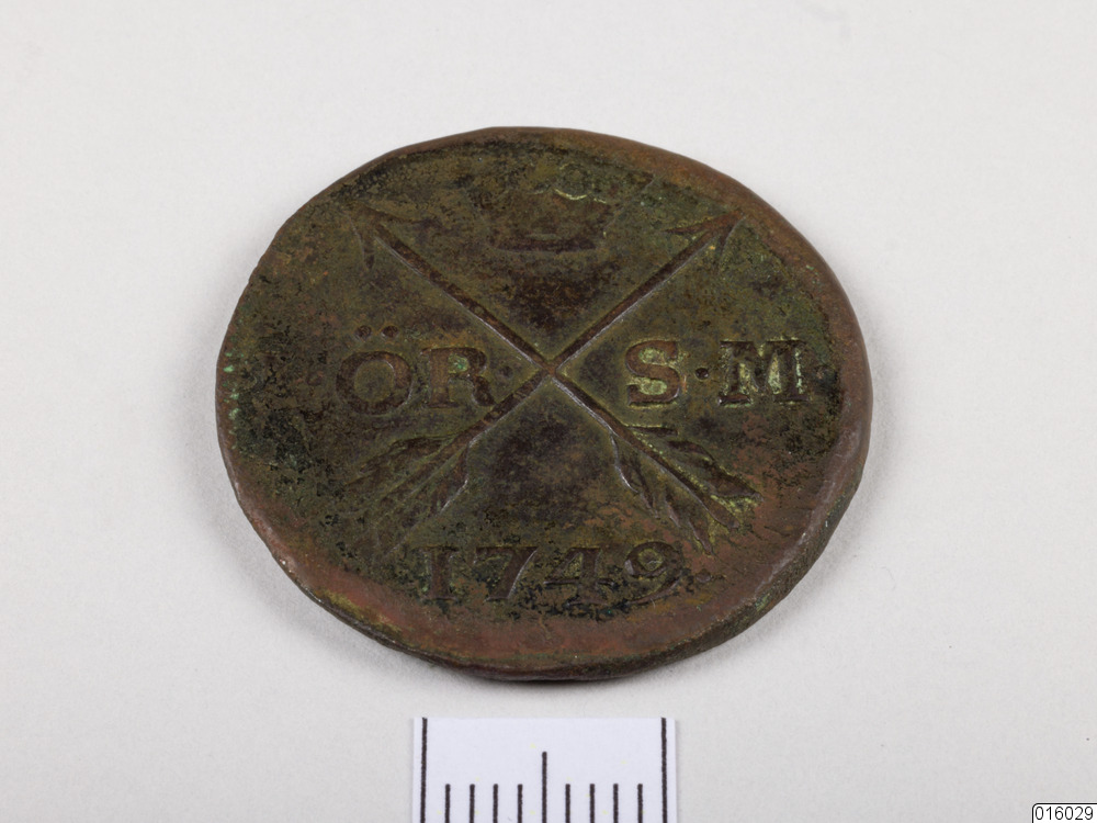 Mynt. Runt kopparmynt med 1 ÖR SM, 1749", två korsställda pilar och en krona, präglade på en sida. På omstående sida finns motställda F omgivna av tre mindre kronor och en stor krona över. Myntets kanter är nötta.