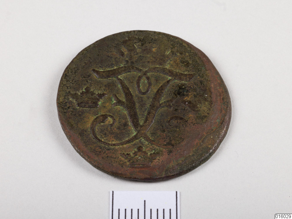 - Mynt. Runt kopparmynt med 1 ÖR SM, 1749", två korsställda pilar och en krona, präglade på en sida. På omstående sida finns motställda F omgivna av tre mindre kronor och en stor krona över. Myntets kanter är nötta.