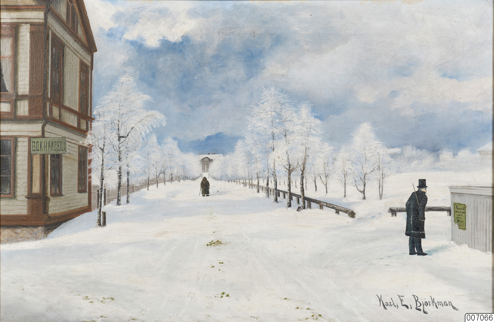 Vid affischen till höger står bokhandelsmedhjälparen Runius. Denne var mycket mån om sitt yttre och nästan året om i livrock och hög hatt, vilket betraktades som en ståndsmässig klädsel. Han var mycket musikalisk och trakterade flera instrument."