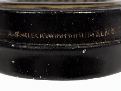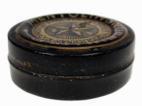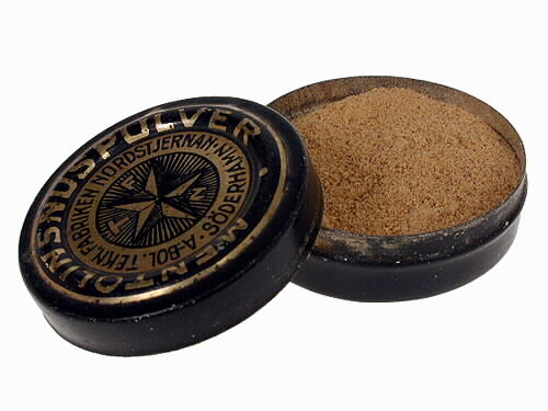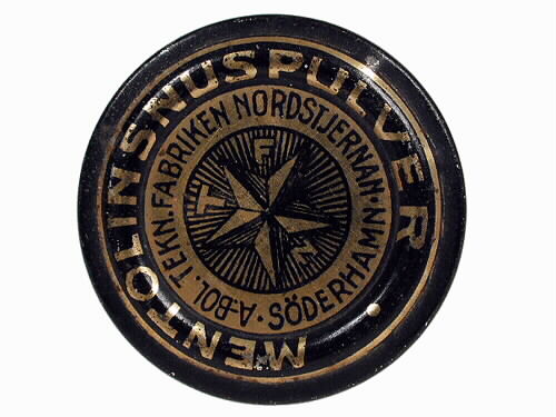 Snusdosa. Rund svart plåtdosa med text på locket i guldfärg: "MENTOLINSNUSPULVER A-BOL. TEKN. FABRIKEN NORDSTJERNAN, SÖDERHAMN". Prislapp på undersidan. Antal delar: 2 st.