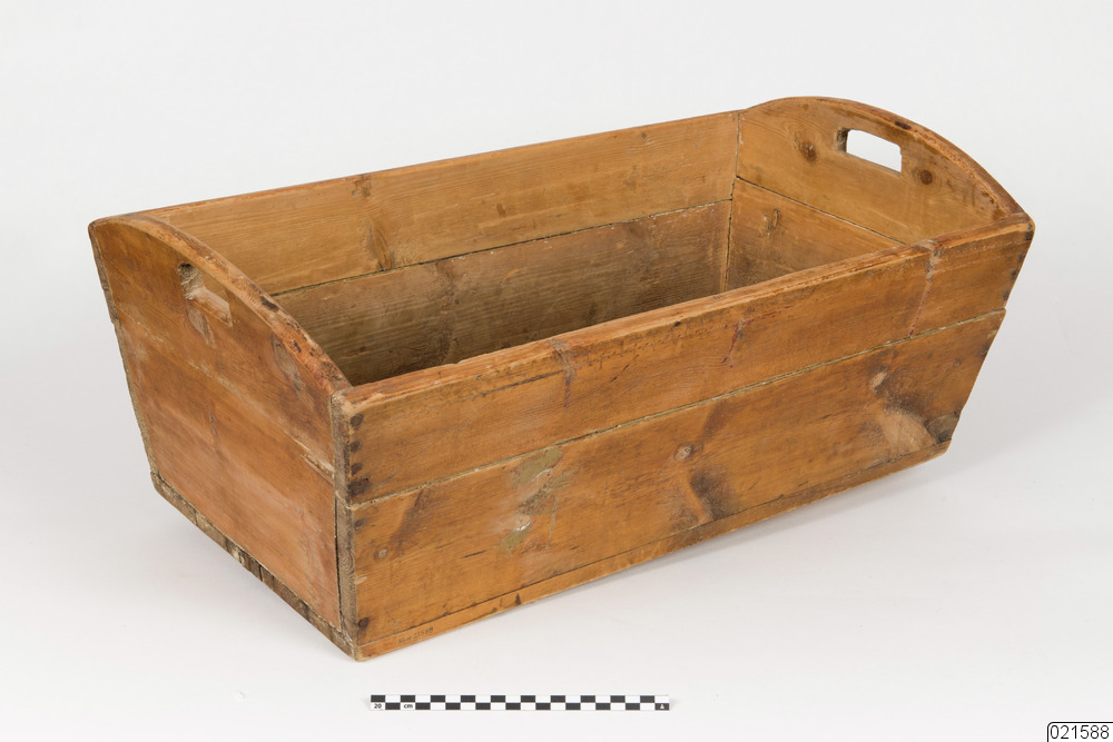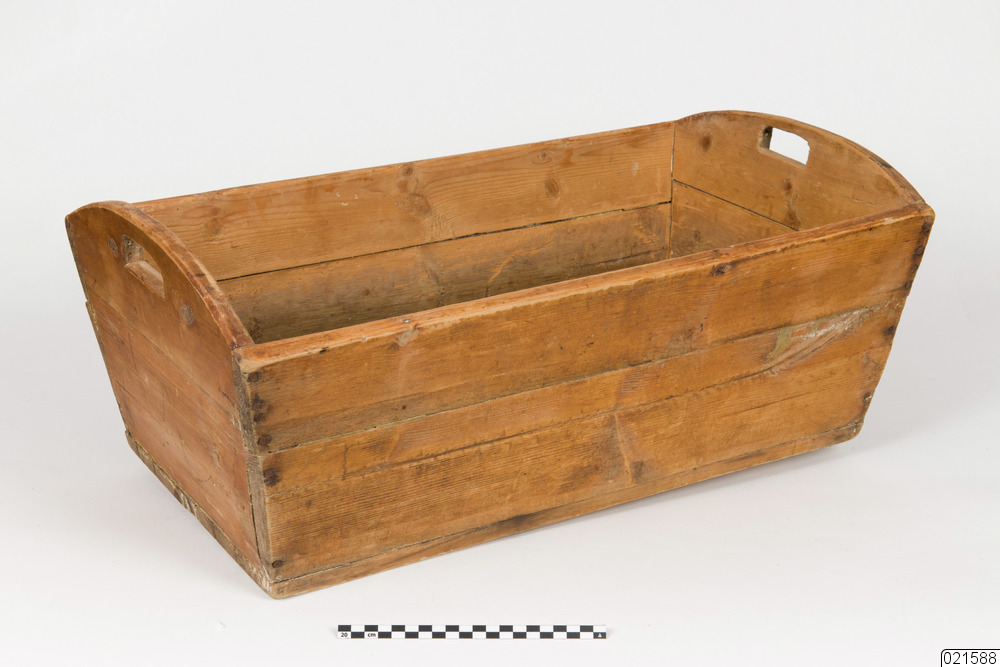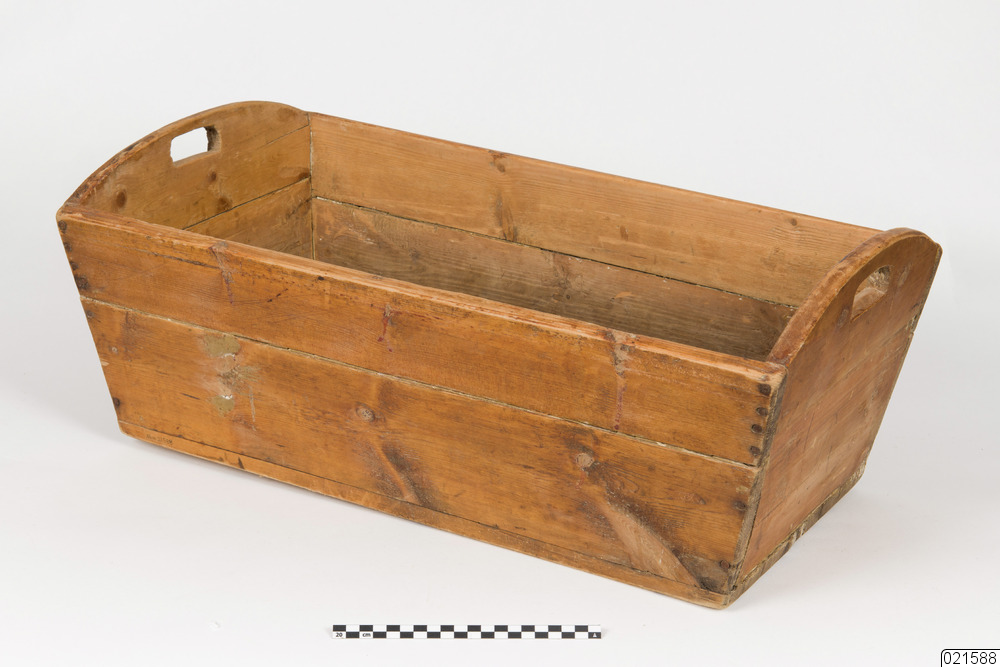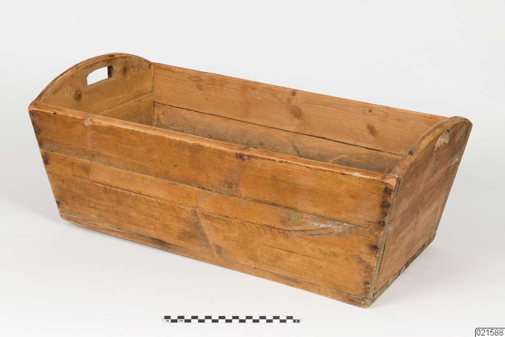 Tråg av hopspikade brädor. På kortsidorna finns uttag förr handtag. Tråget vidgas uppåt.