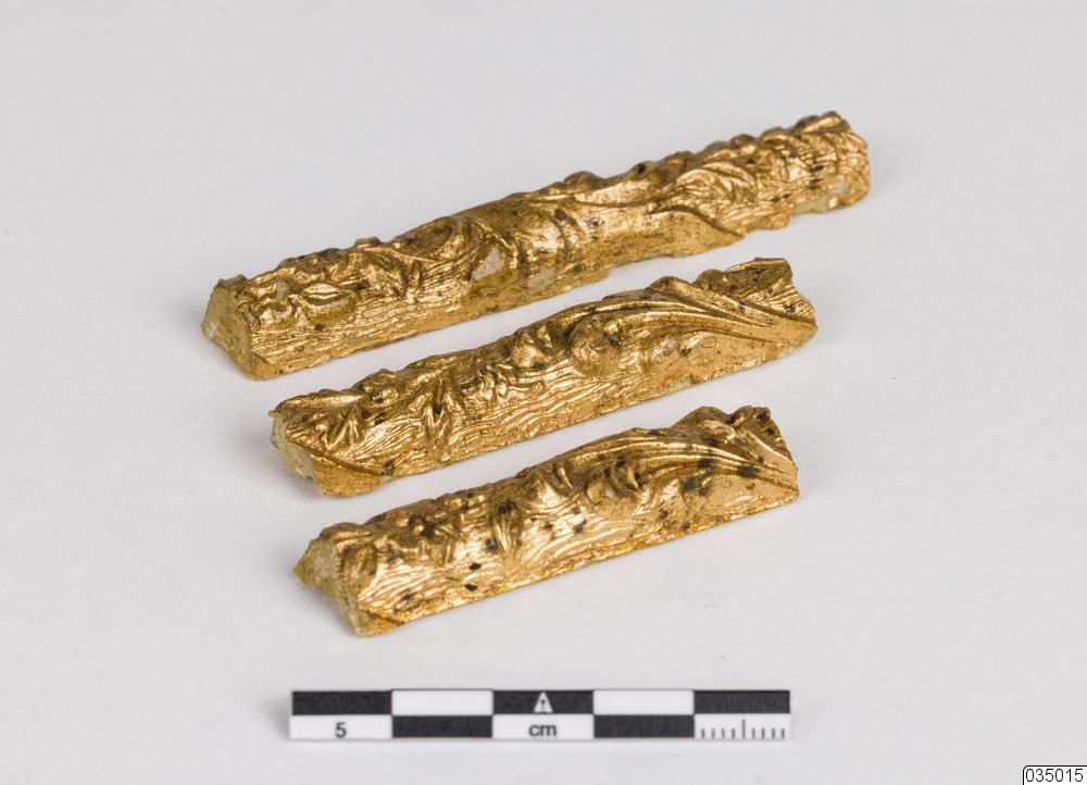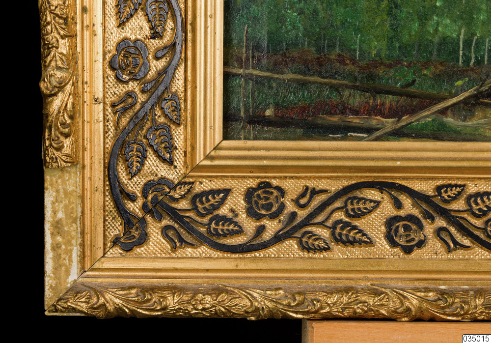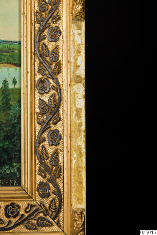 Profilerad, bred, förgylld ram med pastellage och ornament. Bitar av pastellage har lossnat från ramen.