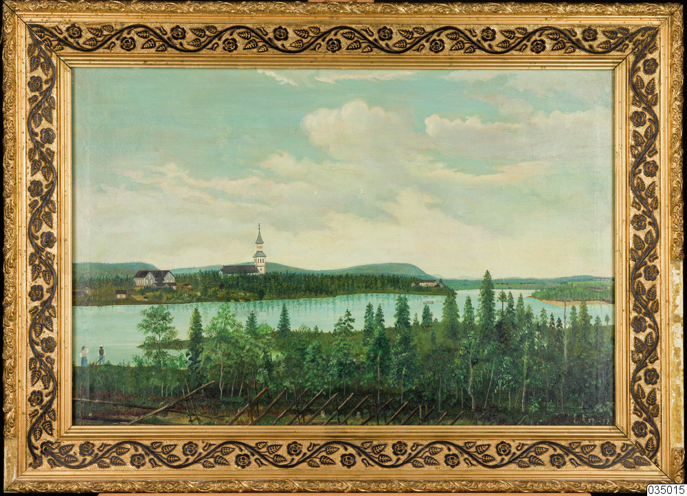 Inramad oljemålning föreställande Tärendöälven och en vy över Tärendö och Tärendö kyrka. Signaturen E. Asp. - 97. syns i nedre högra hörnet.