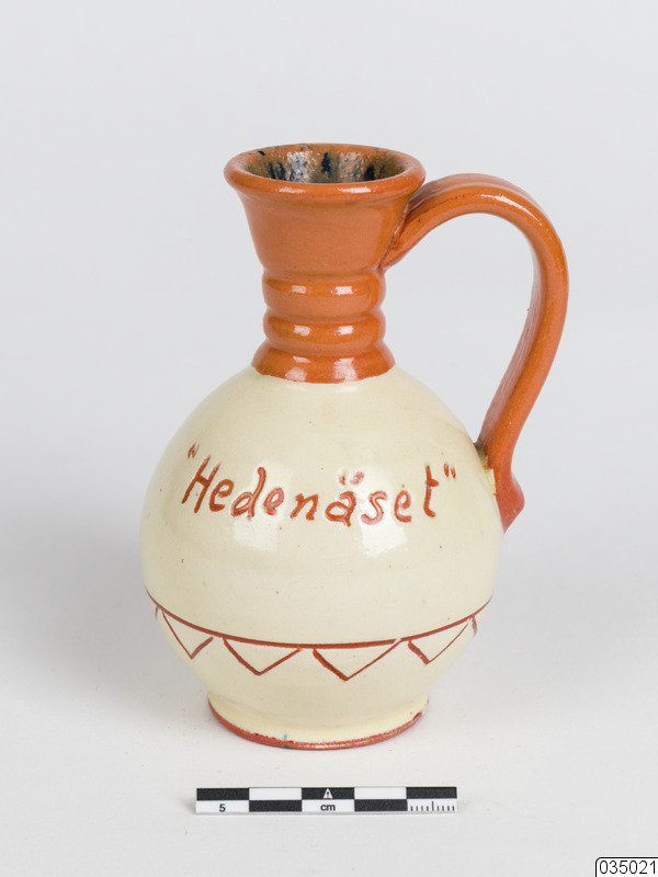 Liten, amforaformad vas/kanna av keramik med texten ”Hedenäset”. Glaserad. Märkt på undersidan med bokstäverna "PW".