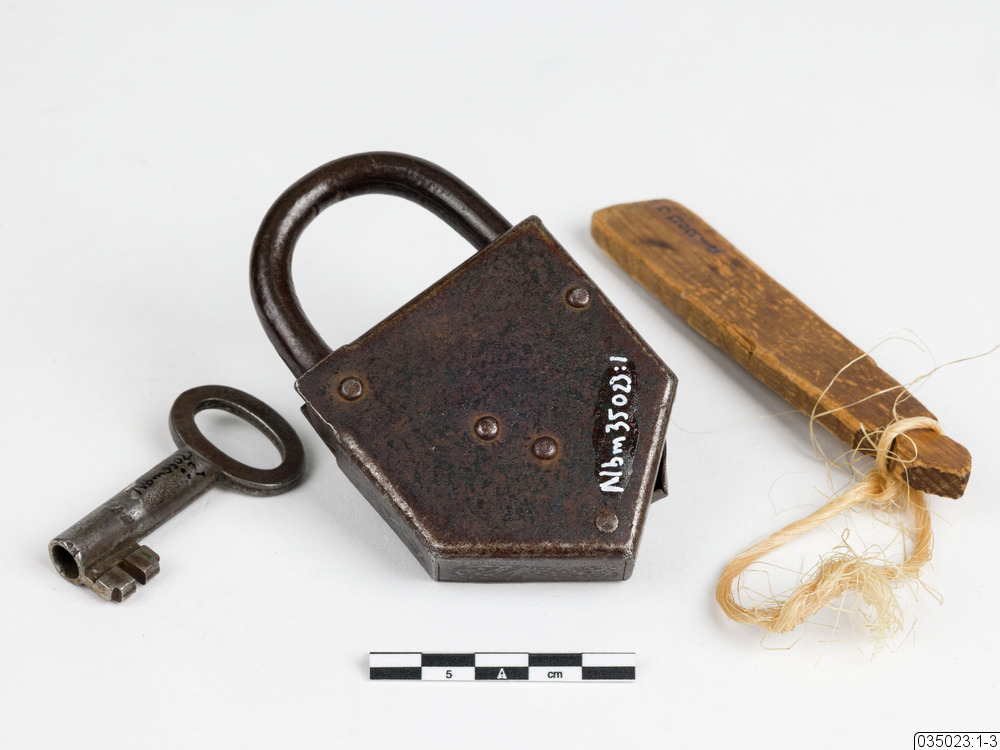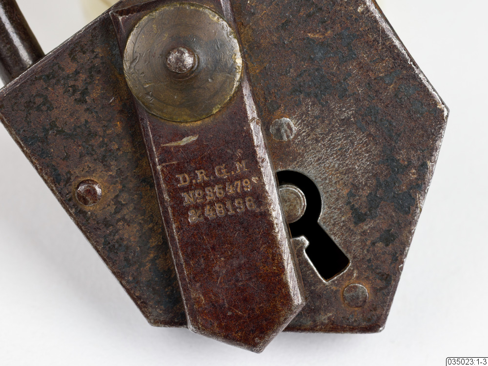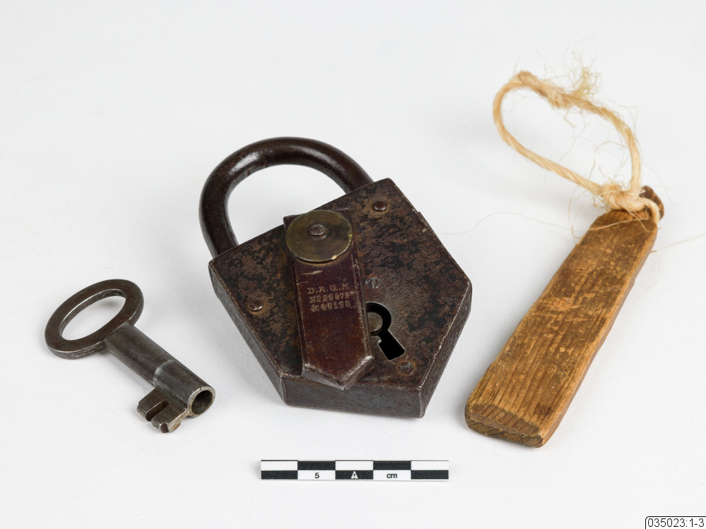 Hänglås (Nbm 35023:1) av järn med nyckelhålsskydd och nyckel (Nbm 35023:2). Vidhängande nyckelbricka (Nbm 35023:3) av trä. Märkt: D.R.G.M, NO 86479 & 48198. Av tyskt fabrikat.