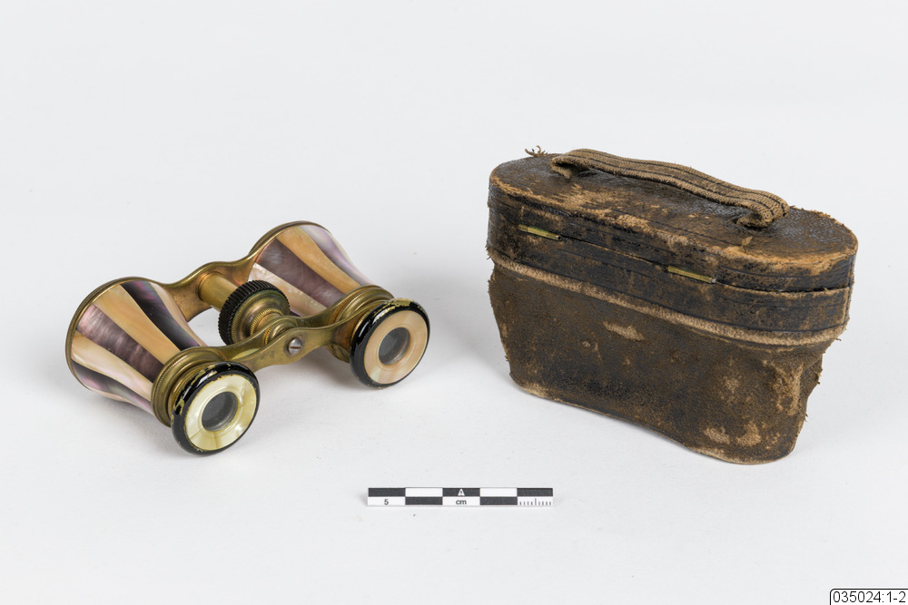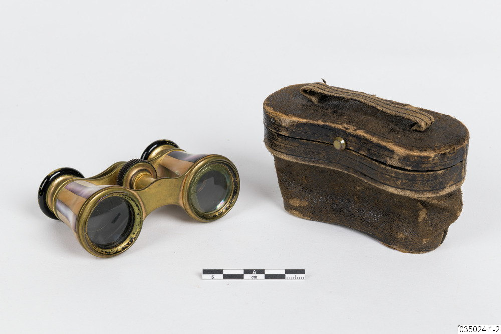 Kikare av mässing, tuberna klädda med pärlemor. Mellan tuberna en räfflad skruv för skärpeinställning. Fodral i brunt skinn med rött sidenfoder. Knapp/lås av mässing.