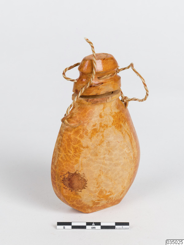 Träflaska med rund renhornsinläggning med gravyr. Kork/propp av trä, som sitter fast i flaskan med ett tvinnat snöre av skinn. Fernissad eller lackad.