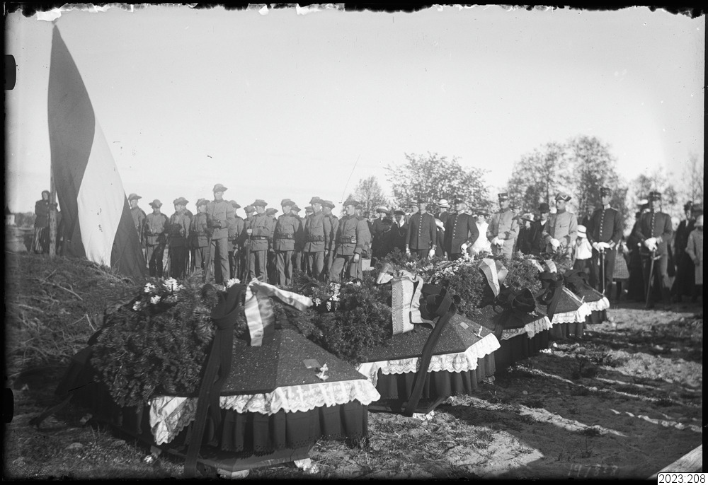Militärbegravning på Haparanda kyrkogård. Kistorna uppställda på granris. Svenska landstormsmän paraderar. År 1914-1918.