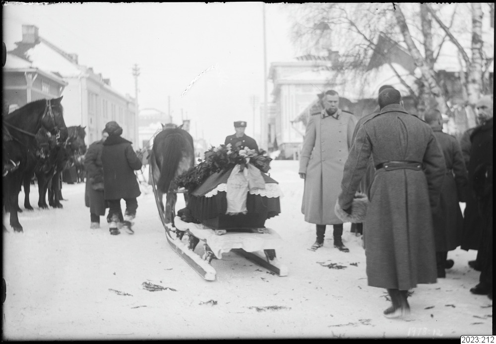 Militärbegravning i Torneå. Kista transporteras bort med släde. Rysk militär, följer begravningståget. Offren från Holmsvedasolyckan, ryssar. År 1914-1918.