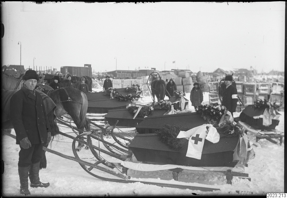 Begravning. Kistor liggande på slädar. Kistan närmast i bild har Röda Kors baneer. Hästarna är förspända meddels rankbågar. Transitogods i bakgrunden. År 1914-1918.