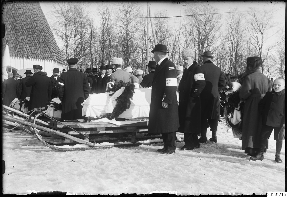 Militärbegravning. Slädar uppställda utanför Torneå kyrka . Två män i förgrunden med armbindel "Tornio TSK" ( Torneå skyddskår ). År 1914-1918.