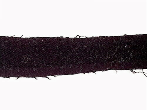 Tygprov. Svart ylletygprov i oliksidig kypert. Spår av maskinsöm längsefter visar att diagonalsidan har använts som rätsida. Provet ligger i en plastficka monterat på ett märkt A4-ark.