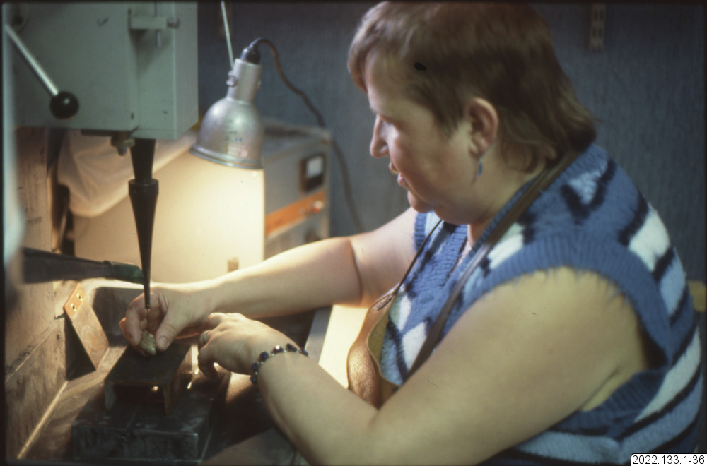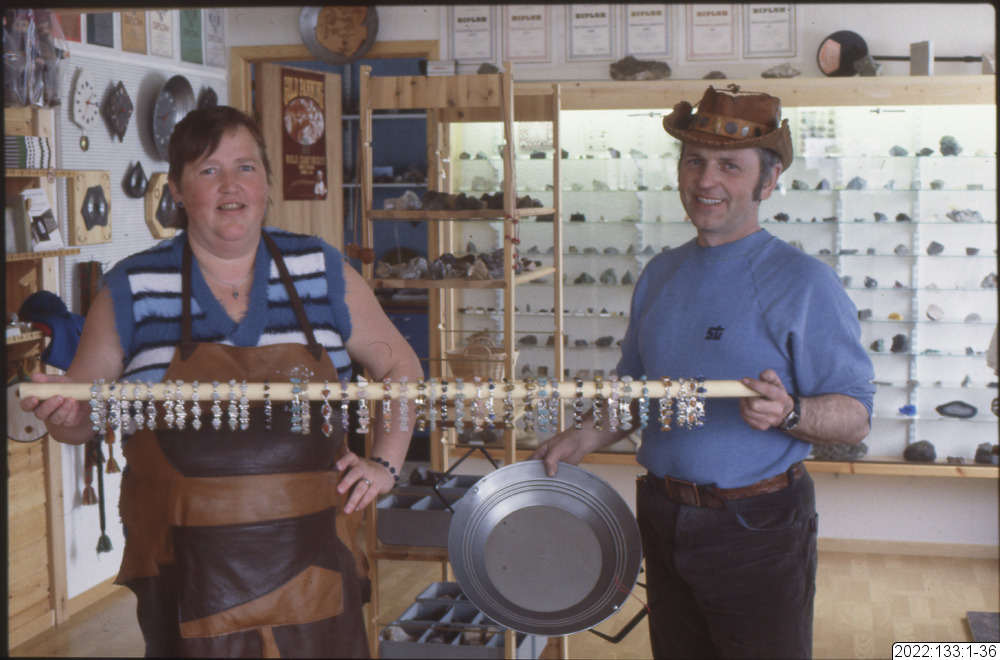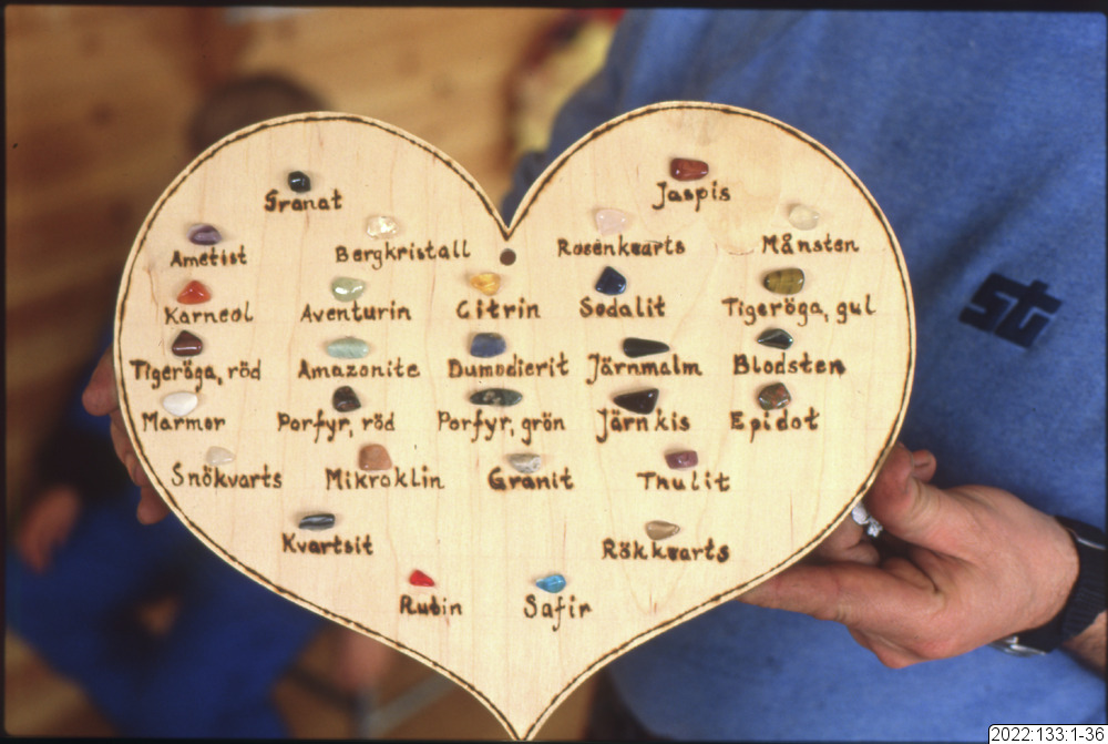 2022:133:1-36 :: hantverk, ädelsten, renhorn, mineral, kött, stensliperi, smycke, sten, närbild, halsband, förkläde, skyltfönster, hatt, kvinna, man, butik, armband, köttorkning, torkning, hjärta