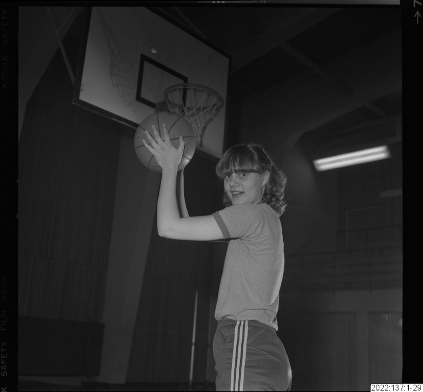 - Annelie Holmgren, Plannja basket, tränar skott på mål, mars 1981