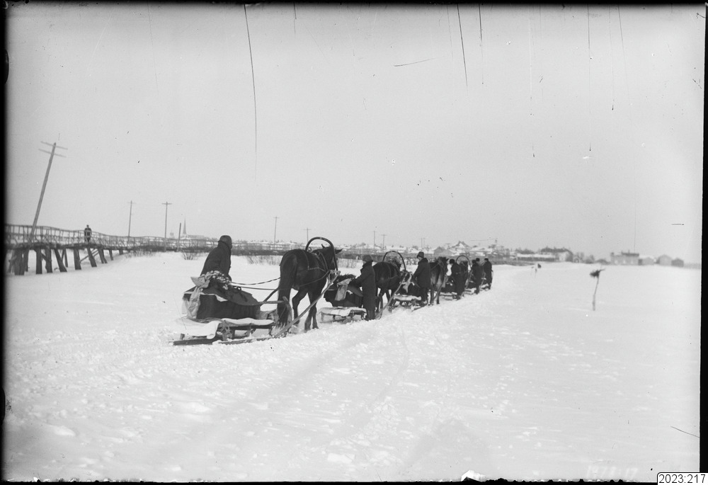 Begravningsfölje på Torneälvens is. Stupade ryska soldater transporteras över till Torneå. Handolinska bron till vänster. Tid: 1914-1918.