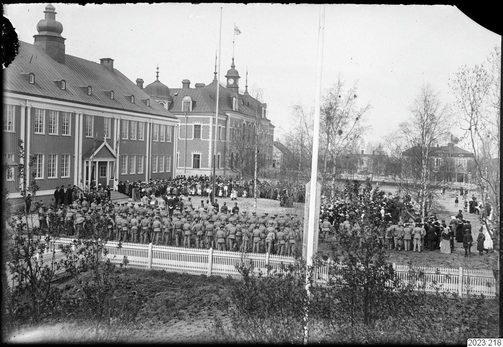 Allmänheten samlad på torget i Haparanda för att lyssna till tal. Talaren och talarstolen står framför seminariebyggnadens trappa. Militärer paraderar.