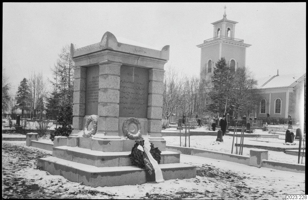 Kransnedläggning vid invalidmonumentet i samband med det turkiska sändebudets besök i Haparanda 1933. Tid: 1933.