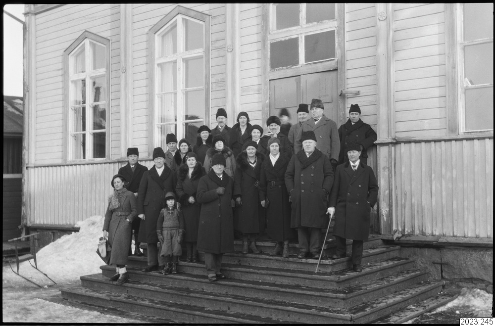 Gruppbild / förmodligen lärare / stående på gamla folkskolans trappa. Repslagargatan. Tid: 1925-1935.