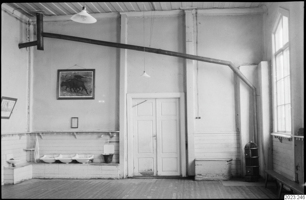 Interiörbild, gamla folkskolan. Entrerummet, med sina tvättställ samt värmekamin till höger. OBS värmeledningsrören från kaminen. Tid: 1920-talet.