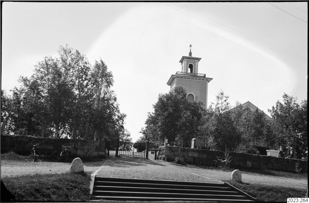 Haparanda gamla stadskyrka, exteriörbild. Bilden tagen efter restaureringen 1937-1938. Kyrkan brann ner 1963. Tid: 1938-1940.