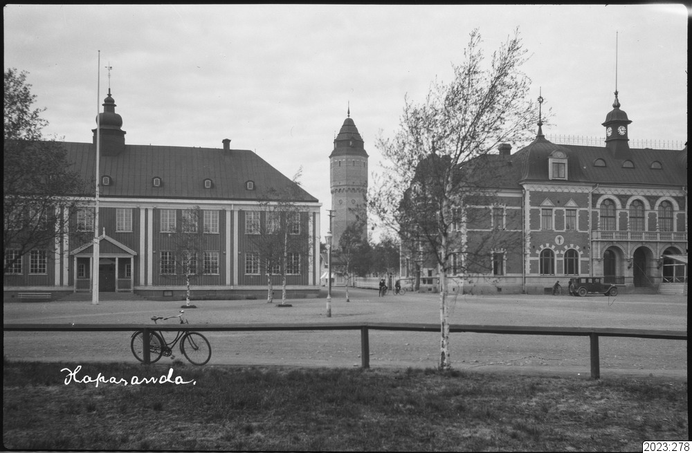 Torget i Haparanda, med seminariebyggnaden, stadshotellet och vattentornet i bild. I negativet inskrivet" Haparanda" använts till vykortstillverkning. Tid: 1920-tal.