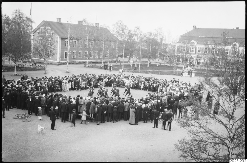 6:e juni festligheterna i Haparanda 1926. Flickor har gymnastikuppvisning på torget. Åskådarna samlad i ring omkring de gymnastisernade flickorna. Tid: 1926, 6 juni.