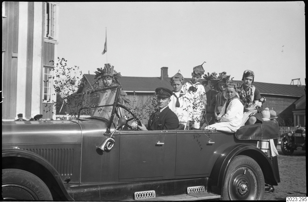 6:e juni festligheterna i Haparanda 1926. Barn utklädda till blommor och fjärilar åkande i bil. Tid: 1926, 6 juni.