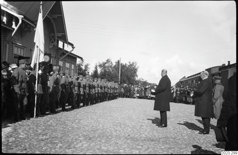 järnvägsstation. Finska soldater paraderar utanför järnvägsbyggnaden. Tid: 1920-tal.