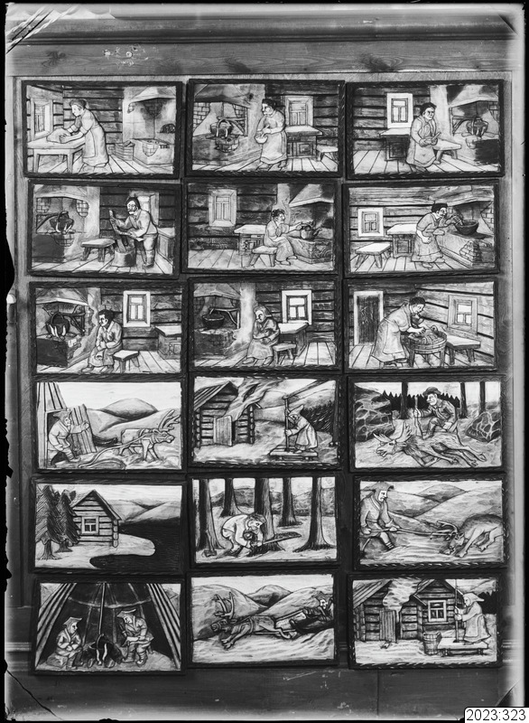 Trätavlor i karvsnitt av bland annat sign "SP-a". Lapp och tornedalsmotiv och interiörbilder från pörten. Viktor Styrmans stolsryggstavlor. Tid: okänt.