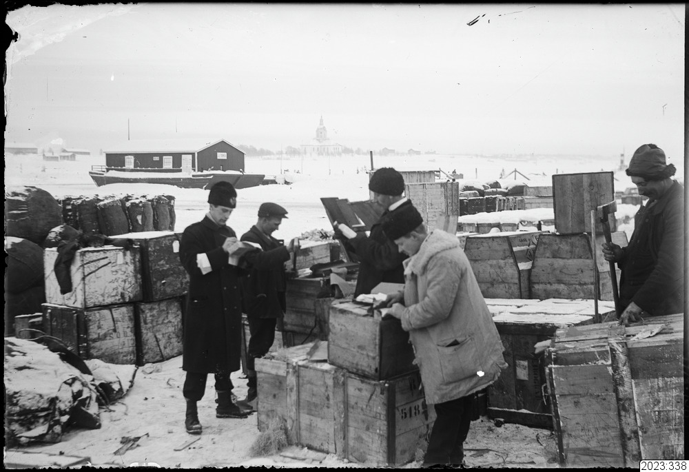 Transitogods uppstaplat vid stranden. Färjan mellan Haparanda - Torneå, samt Alatornio kyrka i bakgrunden. Tid: 1914-1918.