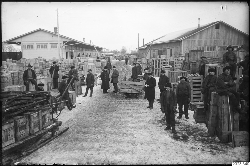 Transitogods uppstaplat. Arbetare stående och sittande på lårarna. Tid: 1914-1918.