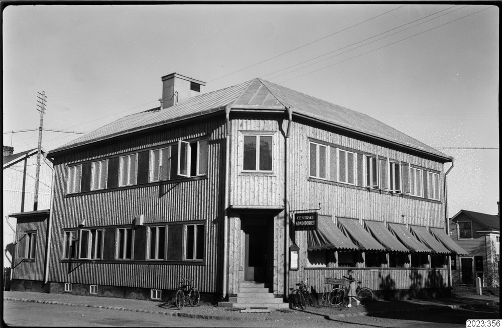 Vinkelbyggt trähus med ingång från hörnet, Lars Lampinens fastighet. Tid: 1930-tal.