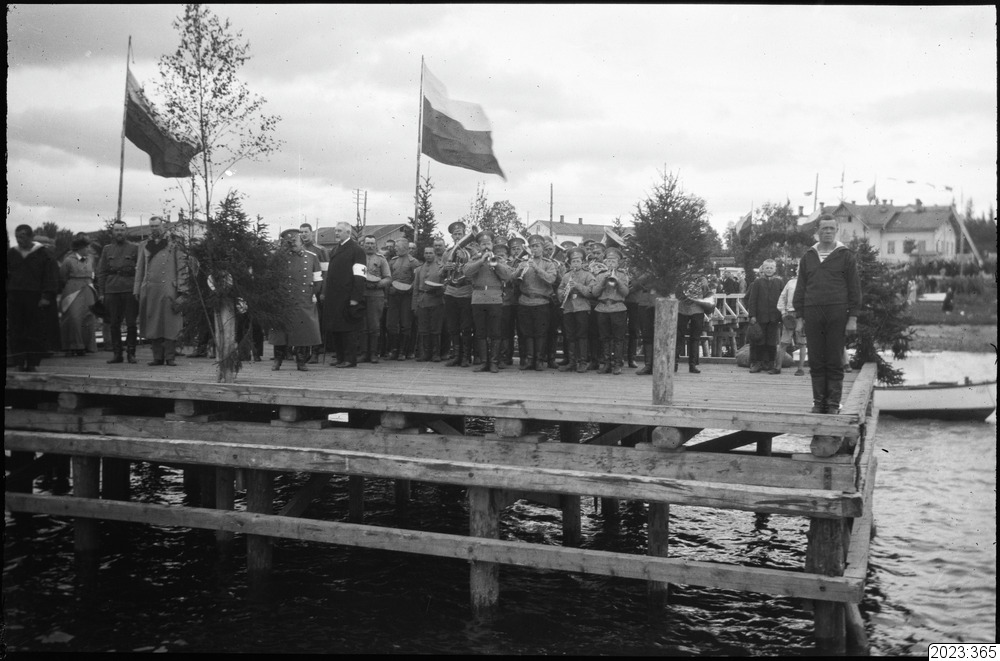 Militärmusikkåren spelar på björkrisdekorerad brygga