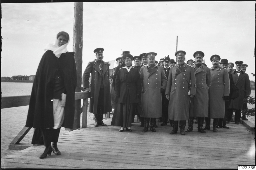 maka och uppvaktning inväntar invalidtransport från Haparanda. Till vänster står ung kvinna i cape och halsduk. Tid: 1915.