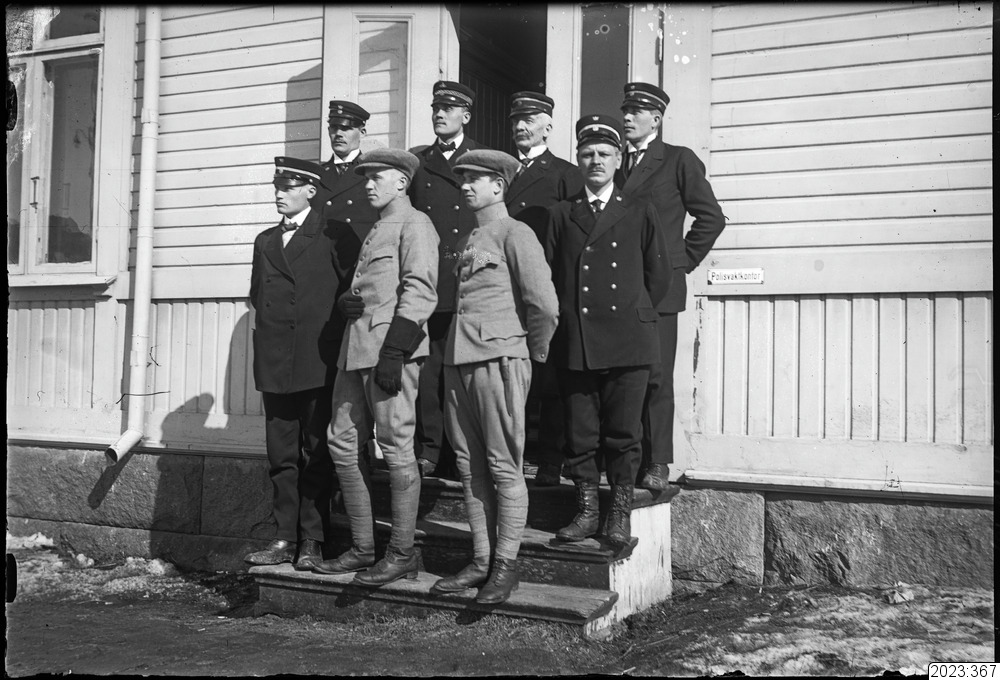 och kriget, stående på polisvaktskontorets trappa. Tid: 1918.