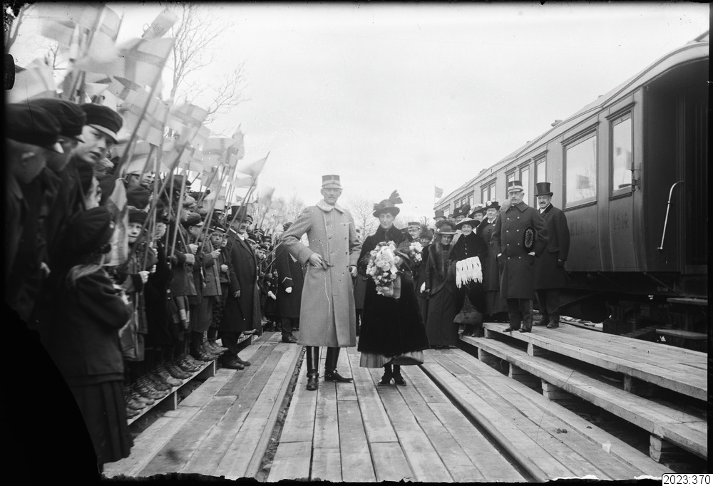 prinsessan Ingeborg mottages på perrongen. Prins Carl besökte Haparanda för att inspektera invalidutväxlingen över Haparanda-Torneå. Den andre mannen fr.h. gränsinspektor G. Hårleman. Tid: 1916, 19 mars.